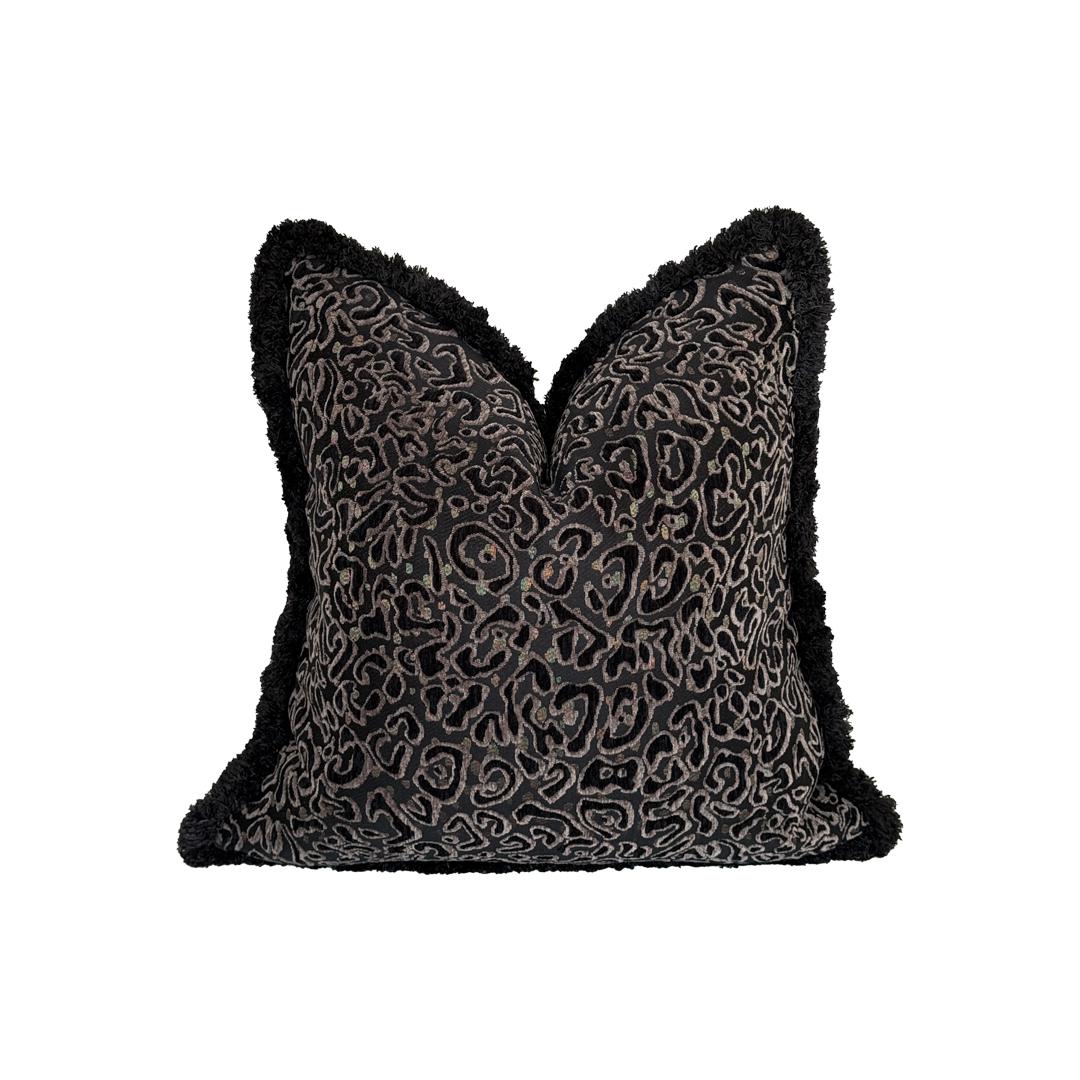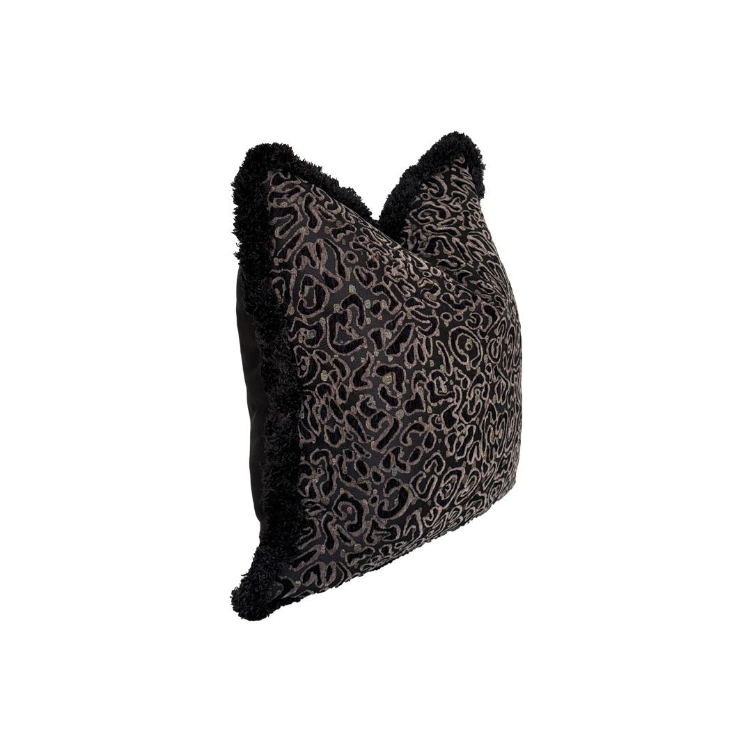 Sahara Noir plays in tonal patterns, rich with quiet movement and depth. Framed in black fringe, it speaks of contrast and calm, a story told in texture and shadow.
